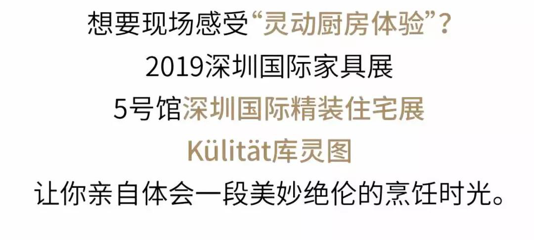 3月19日-22日,深圳國(guó)際精裝住宅展,源自德國(guó)的靈動(dòng)廚房系統(tǒng)TM整體供應(yīng)商Külit?t庫(kù)靈圖,用獨(dú)特的“靈動(dòng)廚房體驗(yàn)”創(chuàng)造精彩廚房生活。