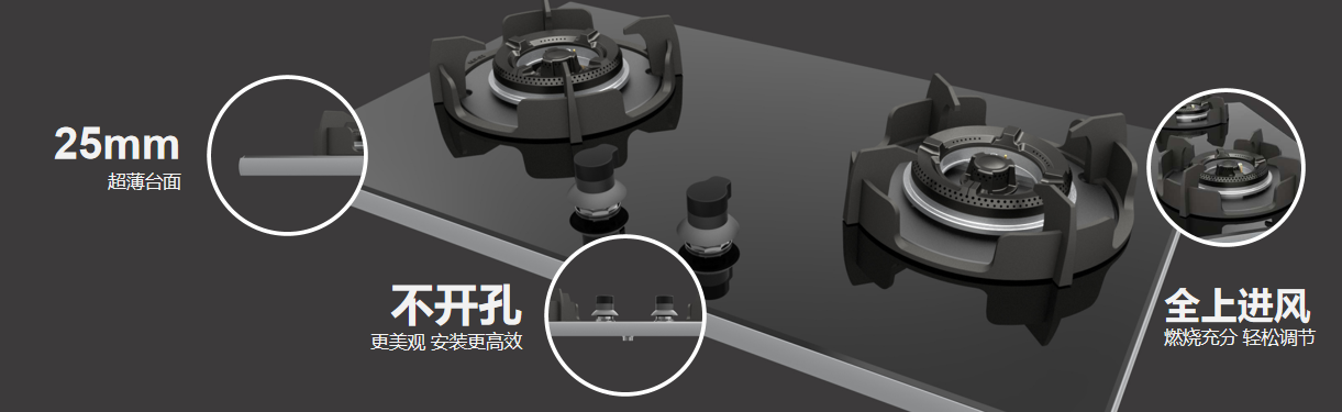 第二款產品是平板式燃氣灶。基于大多燃氣灶臺面開孔、后期滲水等痛點,庫靈圖研發了一款超薄平板燃氣灶,安裝無需開孔,同時采用上進風設計,避免廚柜開孔。